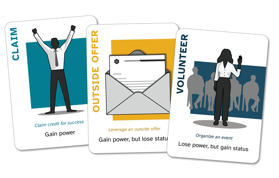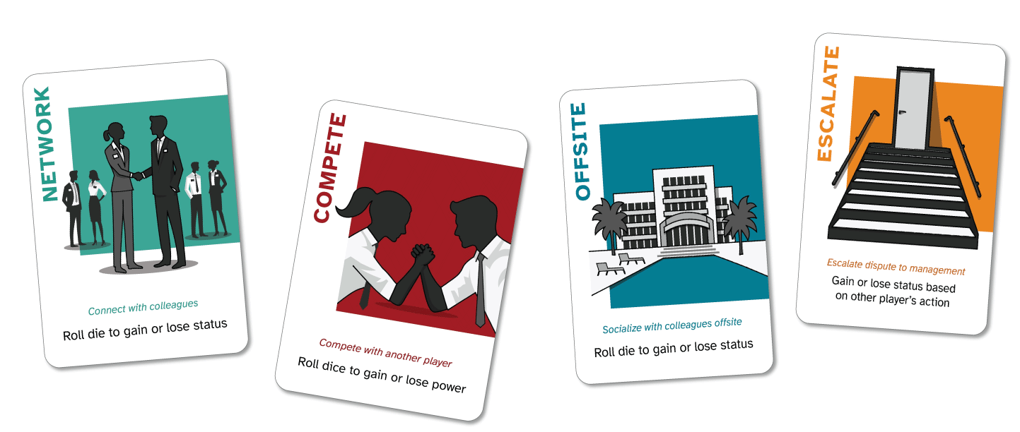 Promotion! is a strategic card game simulating workplace interactions. Actions in the game are inspired by real-world organizational processes and informed by decades of social science research.
